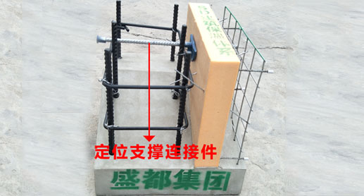 SD建筑保溫體系采用專用定位支撐連接件連接結(jié)構(gòu)層、保溫層和保護(hù)層。專用結(jié)構(gòu)連接件中包含:φ8連接鋼筋,防止保溫板里面鋼筋銹蝕的防腐套管,防止保溫板內(nèi)移的保溫固定片,保證結(jié)構(gòu)鋼筋保護(hù)層厚度的鋼筋固定擋板,以及端頭防腐帽,集連接、支撐、定位、防腐于一體,施工時(shí),將其搭設(shè)在箍筋上,穿透保溫板后旋轉(zhuǎn)連接件,使結(jié)構(gòu)鋼筋與連接件相互作用,有效保證模板支設(shè)、混凝土澆筑過程中,該連接件位置不變形,且無需額外增加結(jié)構(gòu)墊塊或構(gòu)件。使該技術(shù)有了質(zhì)的飛躍。